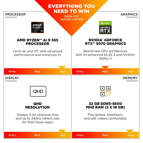 Everything You Need, Nothing You Don'tWith the new OMEN 17, we didn't waste time loading it with features you'd never use. Instead, with an impressive 17" IPS display with 100% sRGB, new AI-enhanced AMD Ryzen™ AI 300 CPUs and NVIDIA RTX™ 50 Series GPUs, as well as a 1-zone RGB numeric keyboard, it's everything you need for great gaming and nothing you don't.[2,3]