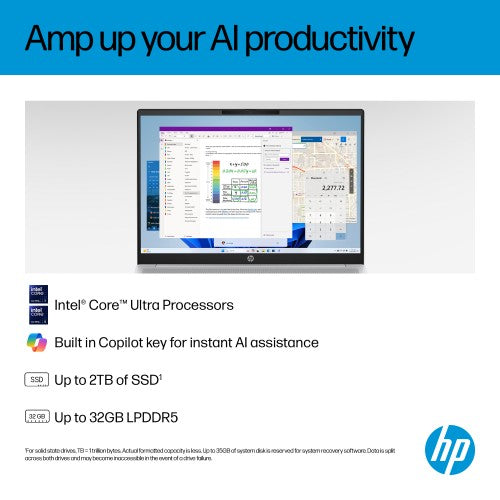 Stay productive on the go with an Intel® Core™ Ultra Processor[1], HP Fast Charge[2] and Copilot hotkey[4].A wider, brighter display