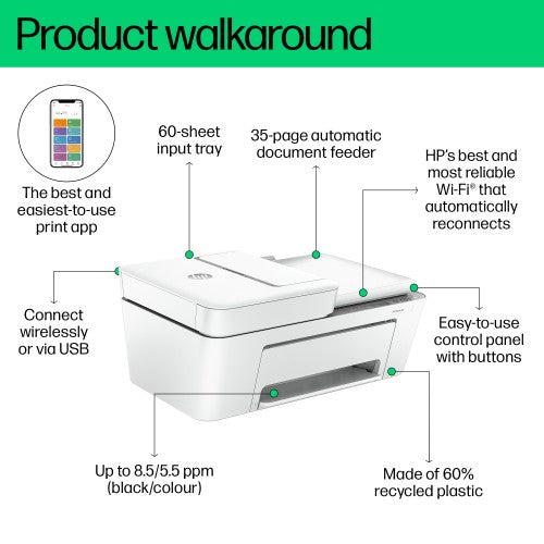 The leader for simple, stress-free printing.[1] Effortlessly print, scan, and copy with this compact, wireless printer with an automatic document feeder, paired with the easiest-to-use print app. From labels to recipes, enjoy a seamless experience from the World’s #1 Printer Company.[2,3]. HP Instant Ink eligibleDynamic security enabled printer Certain HP printers are intended to work only with cartridges that have a new or reused HP chip or electronic circuitry. These printers use dynamic security measures to block cartridges using a non-HP chip or electronic circuitry. Periodic firmware updates will maintain the effectiveness of these measures and block cartridges that previously worked. Reused HP chips and electronic circuitry enable the use of reused, remanufactured, and refilled cartridges.