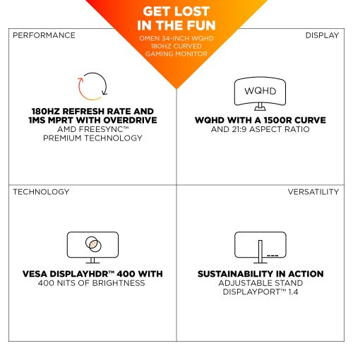 GET LOST IN THE FUNThere is no better joy than fully escaping into the game. The OMEN 34-inch WQHD 180 Hz Curved Gaming Monitor brings the immersion with the ultrawide 1500R curved screen. Quick performance and realistic VESA DisplayHDR™ 400[1] color let you get lost in the games you love most, while the sleek design looks, sounds, and feels great on your desk.