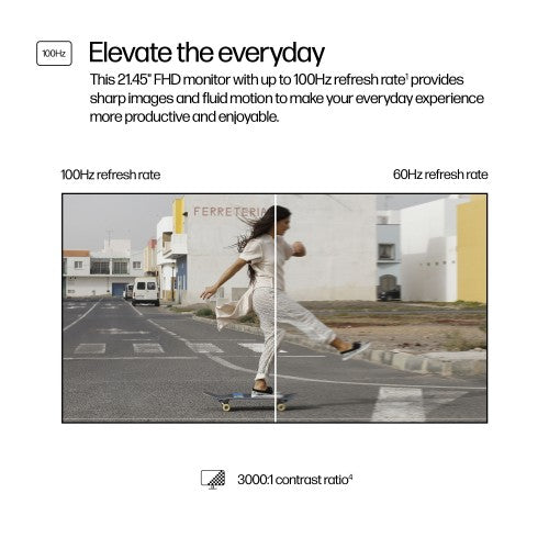 - This 21.45" FHD monitor with up to 100 Hz refresh rate[1] provides sharp images and fluid motion to make your everyday experience more productive and enjoyable.