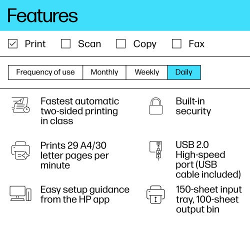 Super capable. Super compact. Increase productivity with this high-performance black-and-white printer in an award-winning compact design.[2] Experience the fastest two-sided printing in class[8] plus simplified setup and time-saving features with the HP app.[3]. HP JetIntelligence CartridgeSpecifications