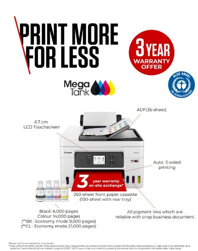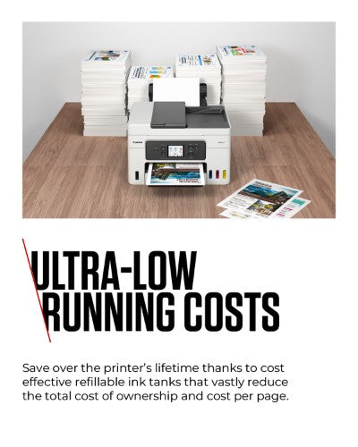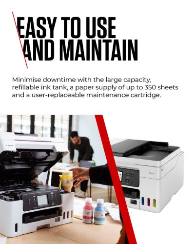 Print large volumes of high-quality business documents while making huge savings on CPP and TCO with this refillable and easy to use 4-in-1 MegaTank-equipped MAXIFY GX printer with ADF, Wi-Fi and Ethernet.Brilliant productivity, best-in-class CPP and TCO