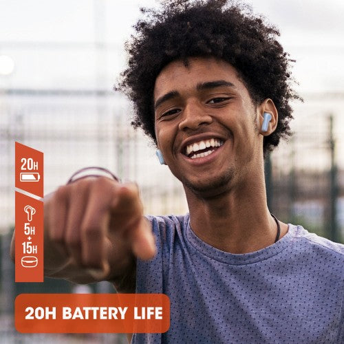 With 5 hours in the earbuds and 15 hours in the case, the JBL Wave 200TWS don’t drop until you do.