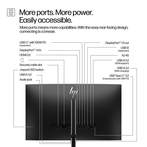 Keep your set up simple and seamless with a display that has everything built in. Connect a keyboard and mouse to the ports on the back of this monitor and only one USB-C® cable to your notebook for data, video, and up to 100W of charging.Daisy Chain a Second HP Series 5 Pro Monitor