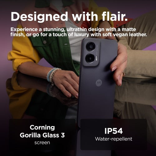 Big screen. Breathtaking moments.Life’s biggest moments deserve a big stage. Meet moto g35 5G. With a huge 6.72’’ FHD+ display, your films, games and video calls come to life even in bright light with 1,000 nits of peak brightness. All backed by multidimensional Dolby Atmos® sound on stereo speakers or your favourite pair of headphones. Take breathtaking shots using the ultra-wide lens or capture sharp and bright photos in any light using the 50 MP camera with Quad Pixel technology. Enjoy a stunning, ultra-thin premium design, including an option with the luxurious feel of vegan leather. Unleash super-fast 5G performance with an octa-core processor – plus get 4 GB of RAM and up to 256 GB of storage.(2,4) And make sure the fun never stops thanks to a long-lasting battery. moto g35 5G is made for big moments.