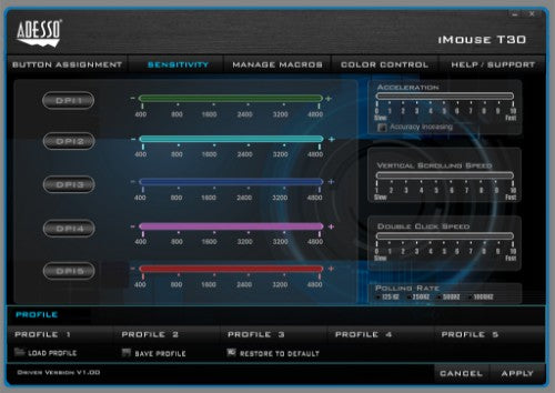 Meet one of the newest models of the Adesso Trackball product line, the Adesso iMouse™ T30. It incorporates the palm grip design where each user can rests his entire hand over the mouse. This design encourages users to move their cursor by rotating the track ball using their thumb and reduces the need of hand movement. It is cable-free by utilizing the 2.4 GHz radio frequency technology, offering a wireless range of up to 30 feet. It’s also fully programmable, meaning every mouse button can be customized to your preferred function with its programmable driver. With its 5 levels of DPI resolutions (400-4800), the optical trackball provides superior accuracy and smooth motion, reducing hand movement and space. This mouse trackball is also easy to maintain – just push the trackball outward from its back, clean it and push it back in place. Its ergonomically contoured large size trackballfurther complete its ergonomic advantages, making your daily computing tasks more comfortable and stress-free.Specifications