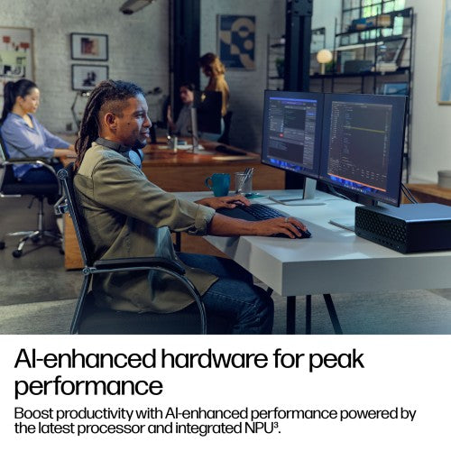Exceed demanding expectations with the HP EliteDesk 8 SFF G1i AI PC is the perfect choice for small workspaces. Powered by the latest Intel Core™ Ultra processor[2] with a 13 TOPS NPU[3], this secure, scalable, and powerful AI PC tackles your multitasking needs.