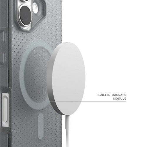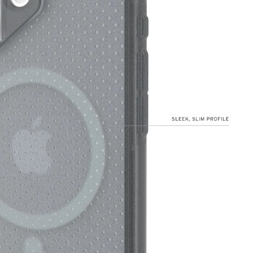 The Dot series is a translucent lightweight case with exceptional military drop protection you trust and love from UAG. Crafted with a rugged co-mold of translucent PC and TPU, it features an advanced impact-resistant core and a raised protective screen surround to guard your device against drops and scratches. Our integrated magnet module locks your device securely in place when using wireless chargers or other magnetic accessories. Features an enhanced textured anti-slip traction grip that ensures a secure hold reducing the chance of accidental drops.Specifications